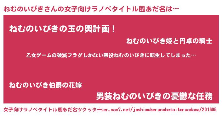 | 男性向けラノベタイトル風あだ名 | 『この素晴らしい世界にねむのいびきを!』 |