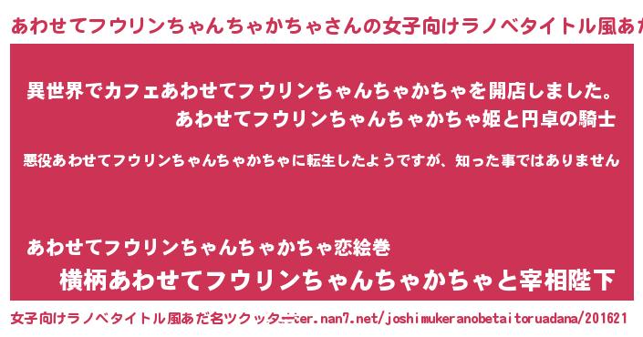 | 男性向けラノベタイトル風あだ名 | 『この素晴らしい世界にあわせてフウリンちゃんちゃかちゃを!』 |