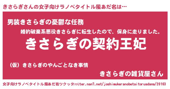 | 男性向けラノベタイトル風あだ名 | 『きさらぎという概念が存在しない退屈な世界 』 |