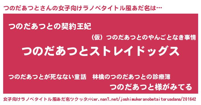 | 男性向けラノベタイトル風あだ名 | 『Re:つのだあつとから始める異世界生活』 |