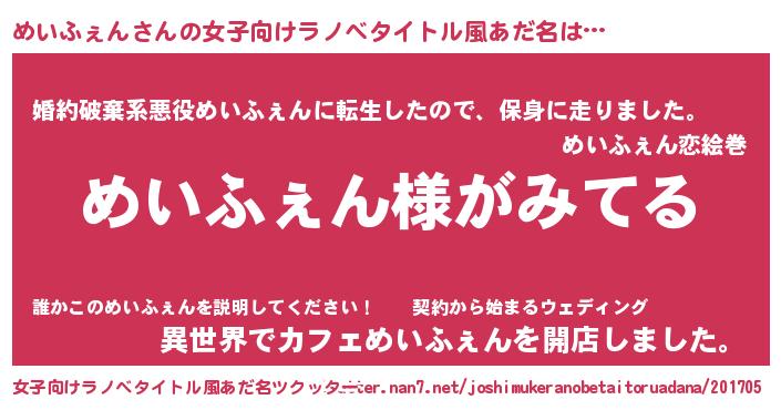 | 男性向けラノベタイトル風あだ名 | 『めいふぇんの嫁は女の子じゃないと思った?』 |