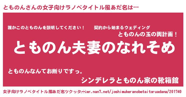 とものんさんの女子向けラノベタイトル風あだ名は… 『とものん夫妻のなれそめ』『誰かこのとものんを説明してください! ~契約から始まるウェディング~』『シンデレラとものん家の靴箱館』 ツクッター #女子向けラノベタイトル風あだ名ツクッター http://tkutter.nan7.net/joshimukeranobetaitoruadana/201740/