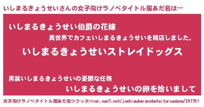 | 男性向けラノベタイトル風あだ名 | 『Re:いしまるきょうせいから始める異世界生活』 |
