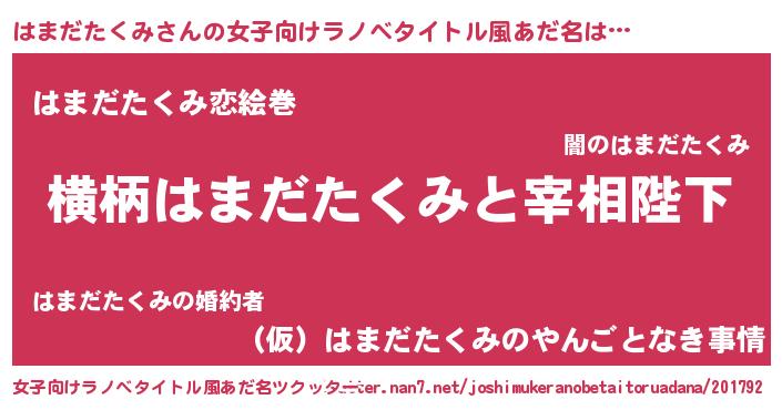 | 男性向けラノベタイトル風あだ名 | 『はまだたくみに滅ぼされるだけの簡単なお仕事です』 |