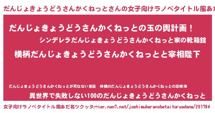 | 男性向けラノベタイトル風あだ名 | 『だんじょきょうどうさんかくねっとに滅ぼされるだけの簡単なお仕事です』 |