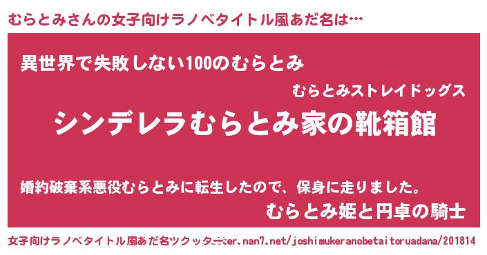 むらとみさんの女子向けラノベタイトル風あだ名は… 『シンデレラむらとみ家の靴箱館』『異世界で失敗しない100のむらとみ』『むらとみ姫と円卓の騎士』 ツクッター #女子向けラノベタイトル風あだ名ツクッター http://tkutter.nan7.net/joshimukeranobetaitoruadana/201814/