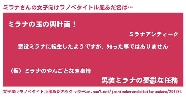 | 男性向けラノベタイトル風あだ名 | 『この素晴らしい世界にミラナを!』 |