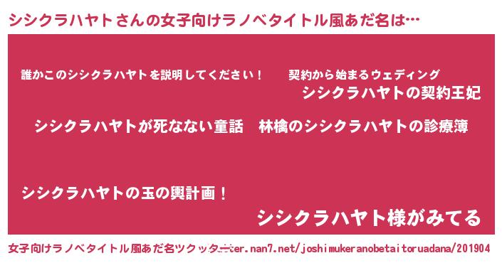 | 男性向けラノベタイトル風あだ名 | 『魔弾の王とシシクラハヤト』 |