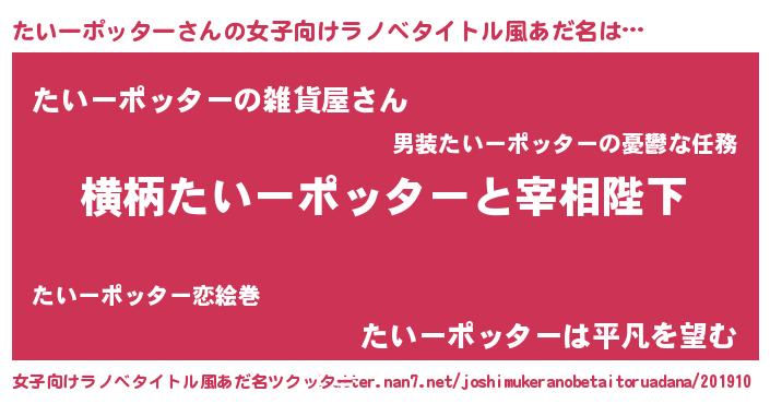 | 男性向けラノベタイトル風あだ名 | 『たいーポッターに滅ぼされるだけの簡単なお仕事です』 |