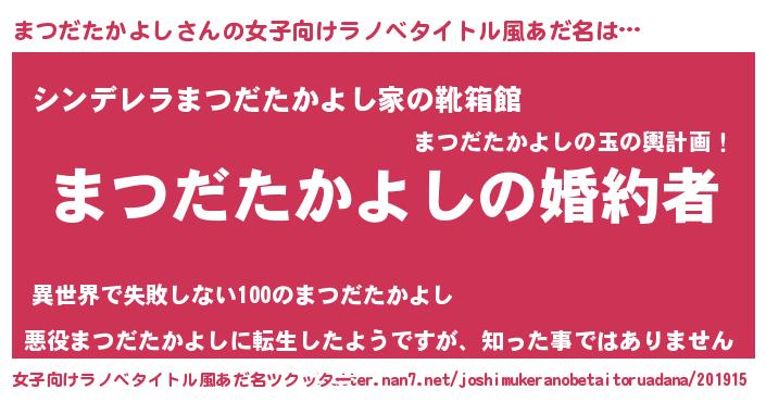 | 男性向けラノベタイトル風あだ名 | 『うちの娘の為ならば、俺はもしかしたらまつだたかよしも倒せるかもしれない。』 |