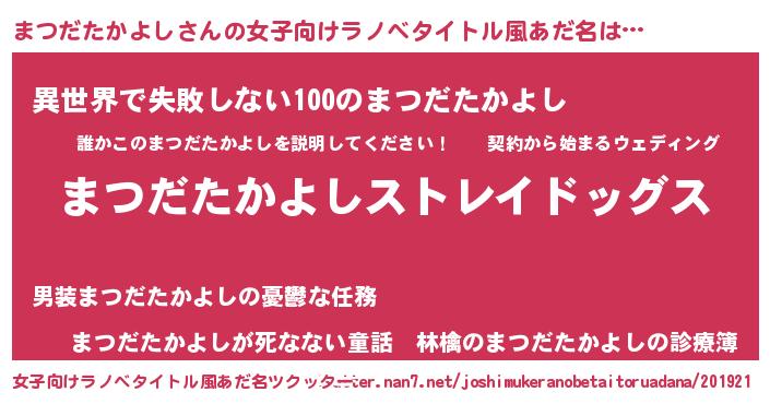 | 男性向けラノベタイトル風あだ名 | 『Re:まつだたかよしから始める異世界生活』 |