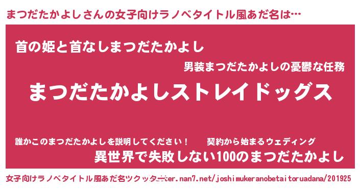 | 男性向けラノベタイトル風あだ名 | 『Re:まつだたかよしから始める異世界生活』 |