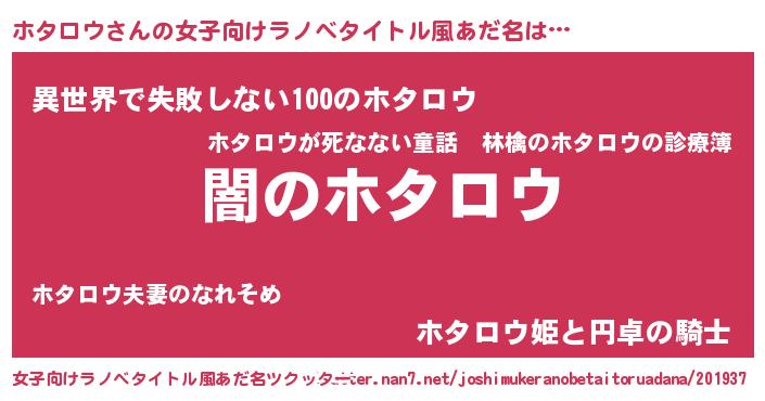 | 男性向けラノベタイトル風あだ名 | 『Re:ホタロウから始める異世界生活』 |