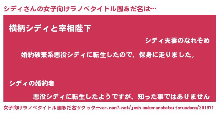 シディさんの女子向けラノベタイトル風あだ名は… 『婚約破棄系悪役シディに転生したので、保身に走りました。』『横柄シディと宰相陛下』『悪役シディに転生したようですが、知った事ではありません』 ツクッター #女子向けラノベタイトル風あだ名ツクッター http://tkutter.nan7.net/joshimukeranobetaitoruadana/201971/