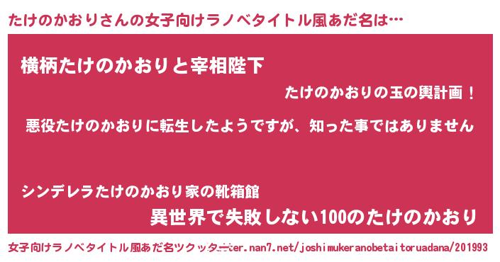 | 男性向けラノベタイトル風あだ名 | 『この素晴らしい世界にたけのかおりを!』 |