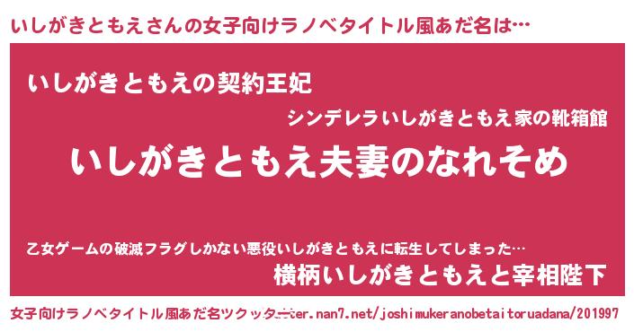| 男性向けラノベタイトル風あだ名 | 『おまえをオタクにしてやるから、俺をいしがきともえにしてくれ! 』 |