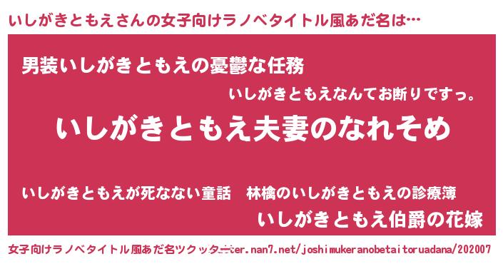 | 男性向けラノベタイトル風あだ名 | 『おまえをオタクにしてやるから、俺をいしがきともえにしてくれ! 』 |