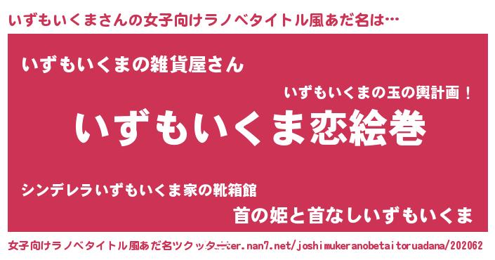 | 男性向けラノベタイトル風あだ名 | 『おまえをオタクにしてやるから、俺をいずもいくまにしてくれ! 』 |