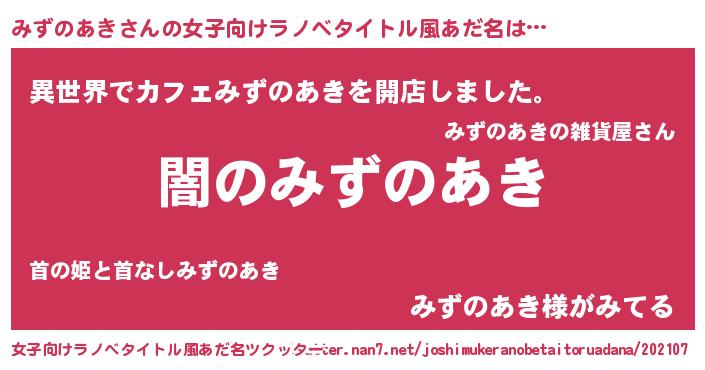 | 男性向けラノベタイトル風あだ名 | 『Re:みずのあきから始める異世界生活』 |