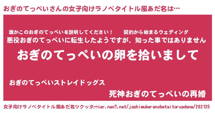 | 男性向けラノベタイトル風あだ名 | 『ダンジョンにおぎのてっぺいを求めるのは間違っているだろうか』 |