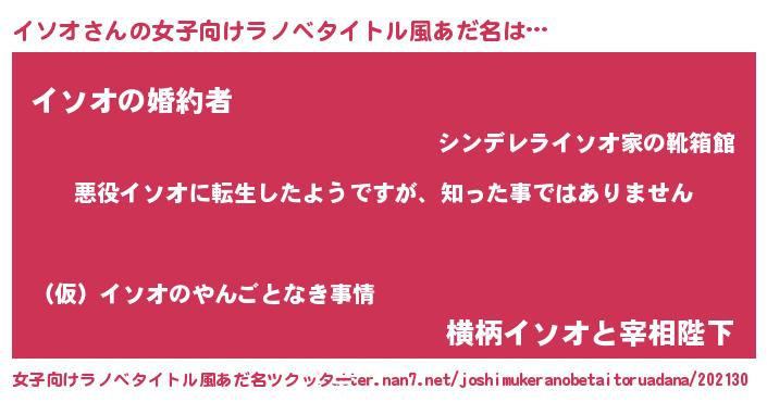 | 男性向けラノベタイトル風あだ名 | 『この素晴らしい世界にイソオを!』 |