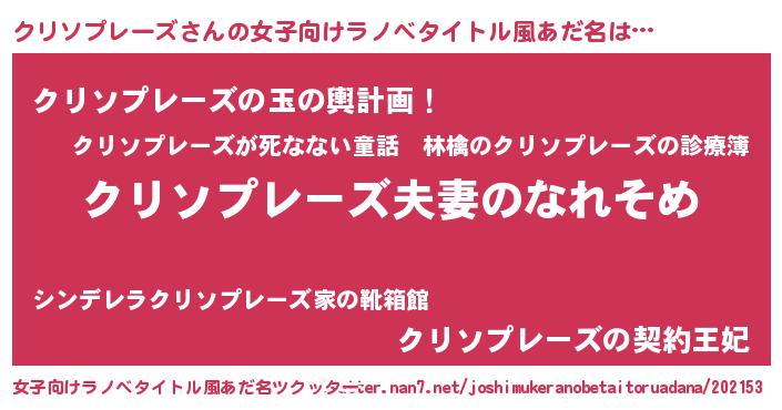 | 男性向けラノベタイトル風あだ名 | 『おまえをオタクにしてやるから、俺をクリソプレーズにしてくれ! 』 |