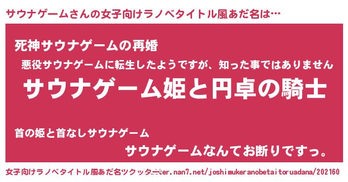 | 男性向けラノベタイトル風あだ名 | 『サウナゲームアートオンライン』 |