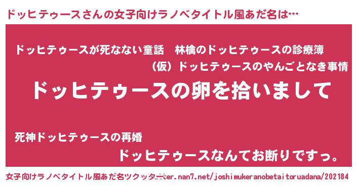 | 男性向けラノベタイトル風あだ名 | 『ドッヒテゥースの嫁は女の子じゃないと思った?』 |