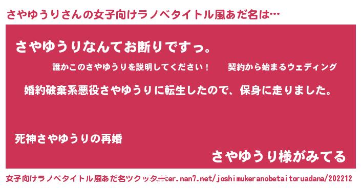 | 男性向けラノベタイトル風あだ名 | 『サヤユウリスレイヤー』 |