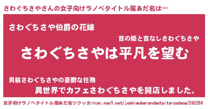 | 男性向けラノベタイトル風あだ名 | 『ダンジョンにさわぐちさやを求めるのは間違っているだろうか』 |