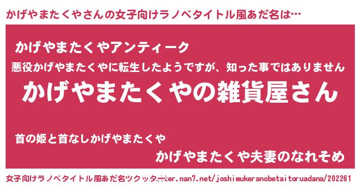 かげやまたくやさんの女子向けラノベタイトル風あだ名は… 『かげやまたくやの雑貨屋さん』『かげやまたくやアンティーク』『かげやまたくや夫妻のなれそめ』 ツクッター #女子向けラノベタイトル風あだ名ツクッター http://tkutter.nan7.net/joshimukeranobetaitoruadana/202261/