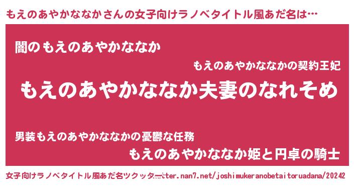 | 男性向けラノベタイトル風あだ名 | 『おまえをオタクにしてやるから、俺をもえのあやかななかにしてくれ! 』 |