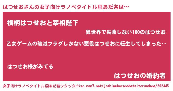 | 男性向けラノベタイトル風あだ名 | 『この素晴らしい世界にはつせおを!』 |
