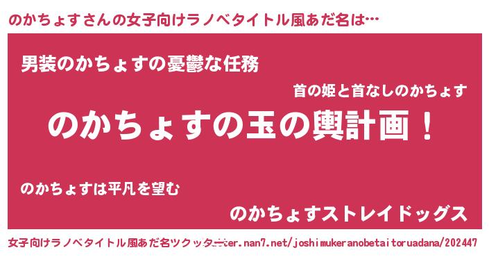 | 男性向けラノベタイトル風あだ名 | 『のかちょす~年齢イコール彼女いない歴の魔法使い~』 |