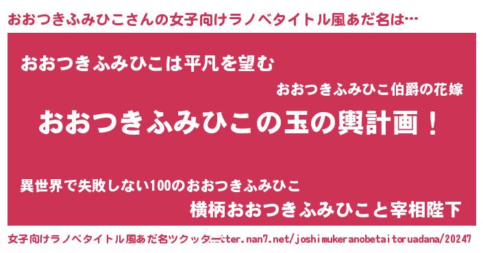 | 男性向けラノベタイトル風あだ名 | 『転生したらおおつきふみひこだった件』 |