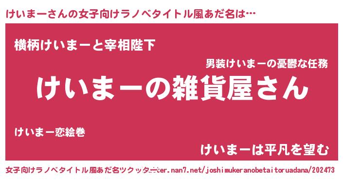 けいまーさんの女子向けラノベタイトル風あだ名は… 『けいまーの雑貨屋さん』『横柄けいまーと宰相陛下』『けいまーは平凡を望む』 ツクッター #女子向けラノベタイトル風あだ名ツクッター http://tkutter.nan7.net/joshimukeranobetaitoruadana/202473/