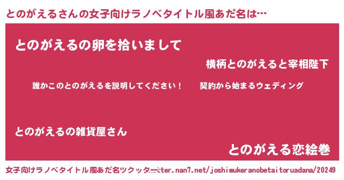 | 男性向けラノベタイトル風あだ名 | 『トノガエルアートオンライン』 |