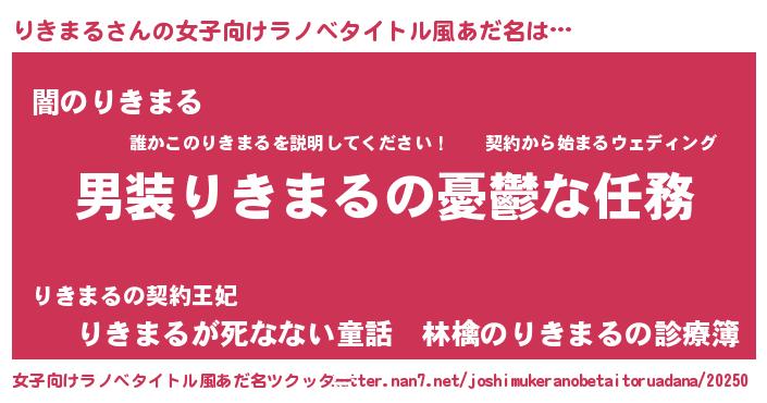 | 男性向けラノベタイトル風あだ名 | 『うちのりきまるが世界を掌握している!』 |