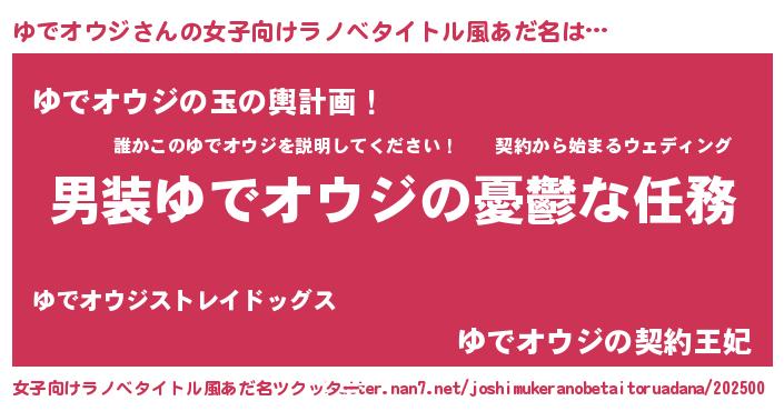 | 男性向けラノベタイトル風あだ名 | 『うちのゆでオウジが世界を掌握している!』 |