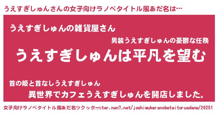 | 男性向けラノベタイトル風あだ名 | 『ダンジョンにうえすぎしゅんを求めるのは間違っているだろうか』 |