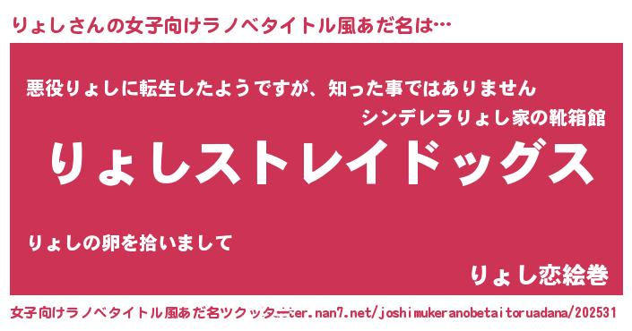 | 男性向けラノベタイトル風あだ名 | 『Re:りょしから始める異世界生活』 |