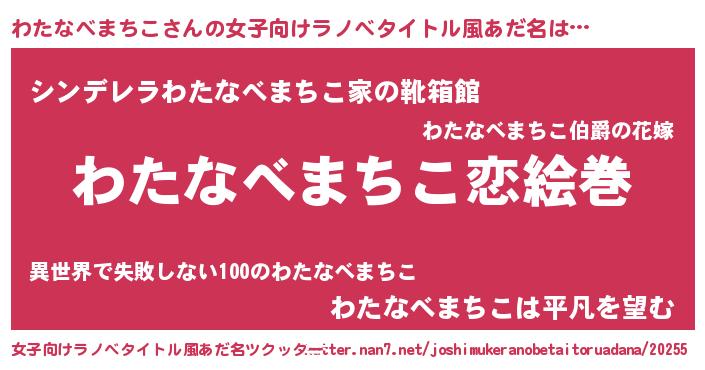 | 男性向けラノベタイトル風あだ名 | 『おまえをオタクにしてやるから、俺をわたなべまちこにしてくれ! 』 |