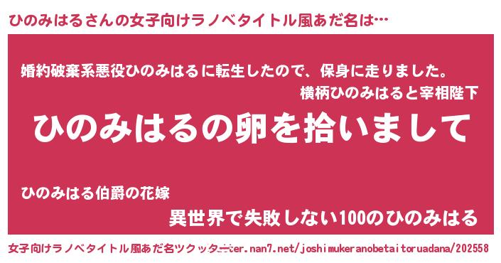 | 男性向けラノベタイトル風あだ名 | 『ひのみはるの嫁は女の子じゃないと思った?』 |