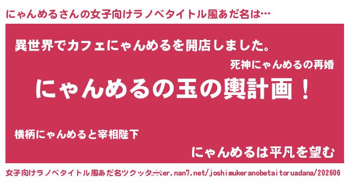 | 男性向けラノベタイトル風あだ名 | 『にゃんめる~年齢イコール彼女いない歴の魔法使い~』 |