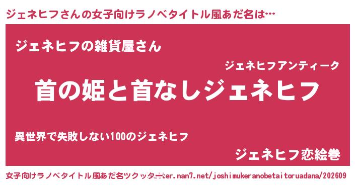 ジェネヒフさんの女子向けラノベタイトル風あだ名は… 『首の姫と首なしジェネヒフ』『ジェネヒフの雑貨屋さん』『ジェネヒフ恋絵巻』 ツクッター #女子向けラノベタイトル風あだ名ツクッター http://tkutter.nan7.net/joshimukeranobetaitoruadana/202609/