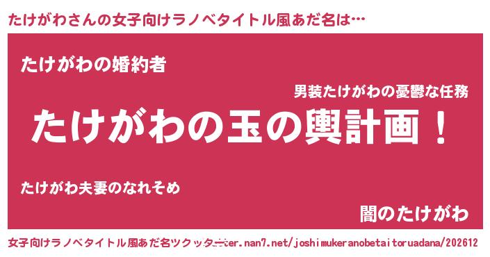 | 男性向けラノベタイトル風あだ名 | 『転生したらたけがわだった件』 |