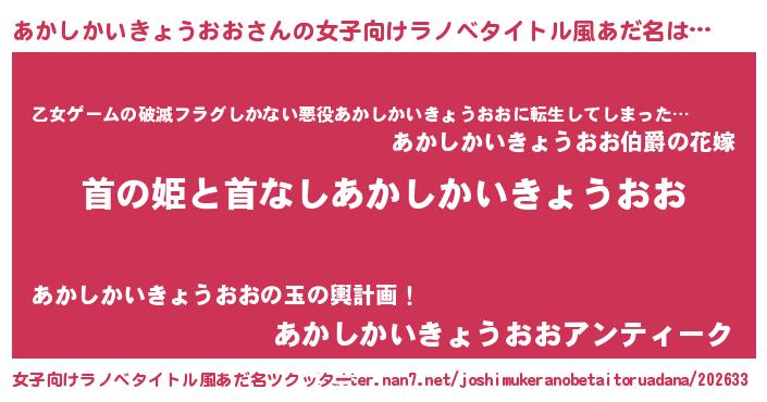 | 男性向けラノベタイトル風あだ名 | 『はたらくあかしかいきょうおおさま!』 |