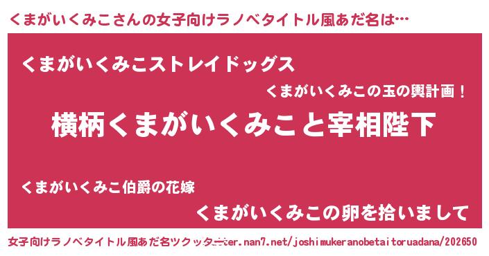 | 男性向けラノベタイトル風あだ名 | 『くまがいくみこに滅ぼされるだけの簡単なお仕事です』 |