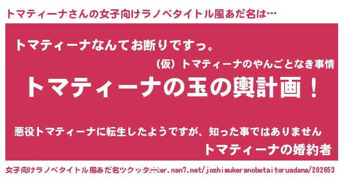トマティーナさんの女子向けラノベタイトル風あだ名は… 『トマティーナの玉の輿計画!』『トマティーナなんてお断りですっ。』『トマティーナの婚約者』 ツクッター #女子向けラノベタイトル風あだ名ツクッター http://tkutter.nan7.net/joshimukeranobetaitoruadana/202653/