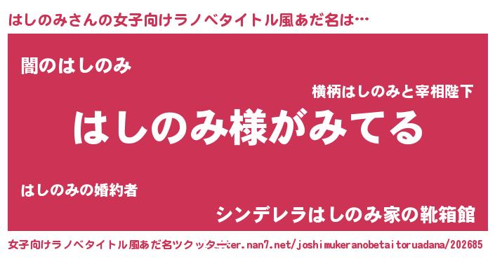 | 男性向けラノベタイトル風あだ名 | 『はしのみの嫁は女の子じゃないと思った?』 |
